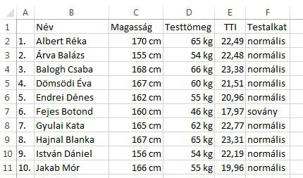 A testtömegindex alapján hét különböző csoprtba lehet sorolni a felnőtt lakosságot. Mi egy egyszerűbb besorolást használnánk: sovány – normális – túlsúlyos. Ezeket a szöveges értékeléseket a következő képlettel adtuk meg: