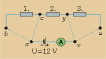 Az ábrának megfelelően kapcsolhatunk három fogyasztót egy 12 V feszültségű áramforrásra. A mérőműszer 400 mA-t mutat, ha az a–b és x–z pontokat köti össze vezeték. Ha a–c és x–z pontokat köti össze vezeték, akkor 480 mA-t mutat a műszer. Ha pedig a–c és x–y pontokat köti össze vezeték, akkor már 1,2 A-t mérünk.