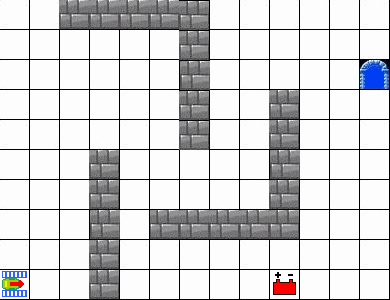 Robi a bal alsó sarokból indul, és a kék kapuba szeretne eljutni. Sajnos minden lépéskor csökken az energiája 1 egységgel, forduláskor pedig 0,5 egységgel. Induláskor 25 egység energiája van, de a piros elemre lépve kaphat még 15 egységet.