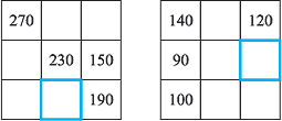 Pótold a bűvös négyzetek hiányzó számait! (Bűvös négyzet sorának, oszlopának és átlójának összege azonos.)